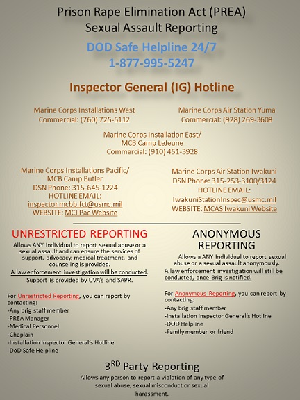 Sexual abuse and sexual harassment is a criminal act that is absolutely incompatible with our core values, high standards of professionalism, and personal discipline. All Marine Corps confinement facilities maintain a zero-tolerance policy approach in all cases of sexual abuse and sexual harassment in accordance with the Prison Rape Elimination Act (PREA).