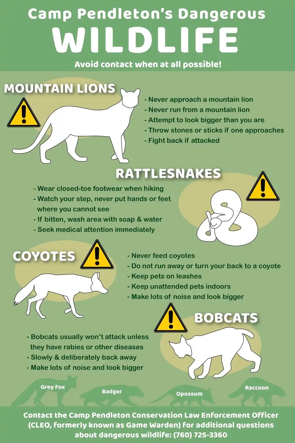 For assistance with Wildlife Conflicts (e.g. snakes, skunks, and large predators), contact a Conservation Law Enforcement Officer at 760-725-3360. For assistance with Domestic Animal Control, contact the Provost Marshal’s Law Enforcement Program at 760-725-3024.